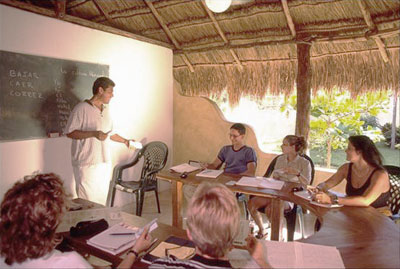 At our Spanish school in Playa del Carmen, classes can be held outside under thatched roofs amidst our own tropical gardens, so you can enjoy the full Caribbean experience. We organize a number of activities and excursions like horseback riding, windsurfing, yoga, movie sessions, cooking classes, snorkeling, beach volleyball and trips to historic Mayan sites.